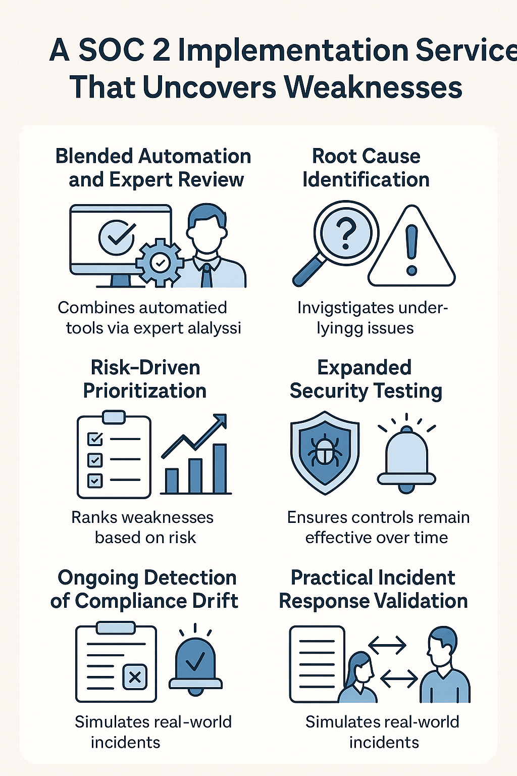 A SOC 2 implementation service designed to expose real weaknesses goes further than a traditional readiness assessment. It uses continuous monitoring, advanced tools, and expert-led testing to identify both obvious and hidden control issues.